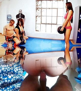 Fitness Rooms Dark-hued Latina Luna Corazon and mature Lithuanian threesome