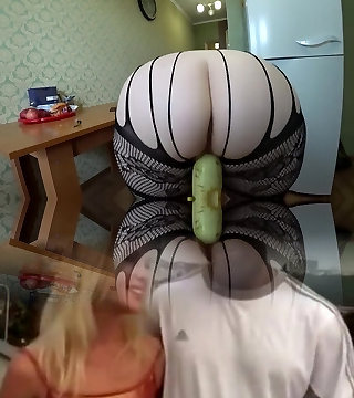 Girlfriend with zucchini fucked busty milf in the kitchen, lesbos Point Of View.
