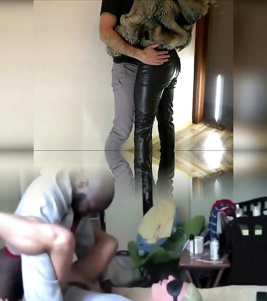 Super-hot spunky standing pound in clothes, fur coat, leather legging, leather high high-heeled shoes
