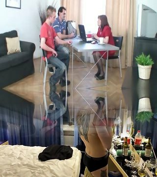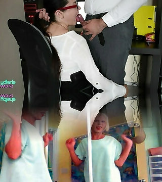 Two Ash-blonde Dommes Spank and Cane Office Guy