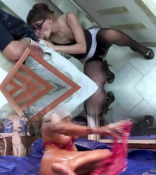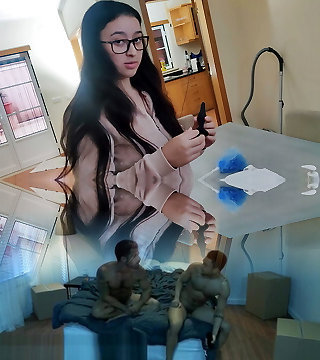Maid with glasses using a butt ass-plug and remote vibrator gets internal money-shot
