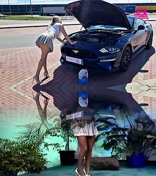 Platinum-blonde in high stilettos masturbates with a dildo stuck to the car