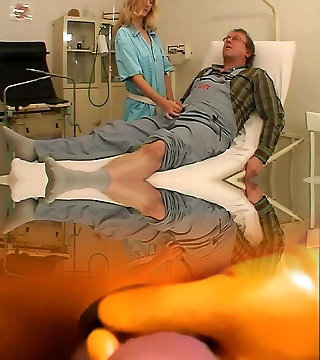 Granny nurse gets in the exam tabouret and looks in her beaver