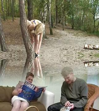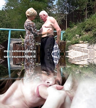 Old blonde breezy takes two cocks outdoors