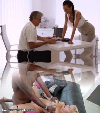 An outstanding mature monde in magnificent black lingerie is having two big cocks on her bosses office desk